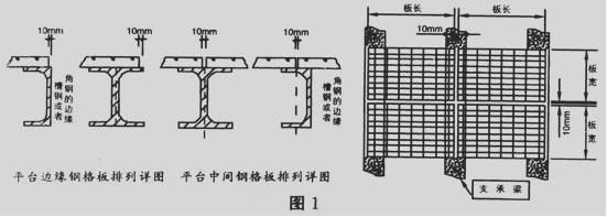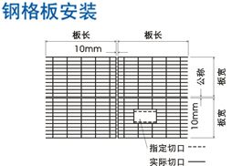 钢格板的安装时,钢格板受荷扁钢两端必须支承在钢粱或其它支承架上,每端搭接长度不少于25mm。两钢格板间距通常为10mm,安装时需根据图纸要求和现场实际情况作适当调整,在安装钢格板时最小安装间距应满足以下要求:钢格板之间间距为3mm,钢格板与相邻结构间距为10mm。