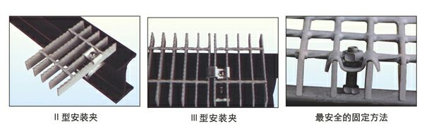 钢格板安装夹使用方法: 安装夹在钢格板的四个角上,将钢格板用安装夹紧固在支承粱上,必须最大限度的紧固以避免松脱。原则上每块钢格板(约1平方米计)不少于四套安装夹,安装夹固定的方法是安装在钢格板的四个角上,安装夹使用数量随着板长度的增加而增加。