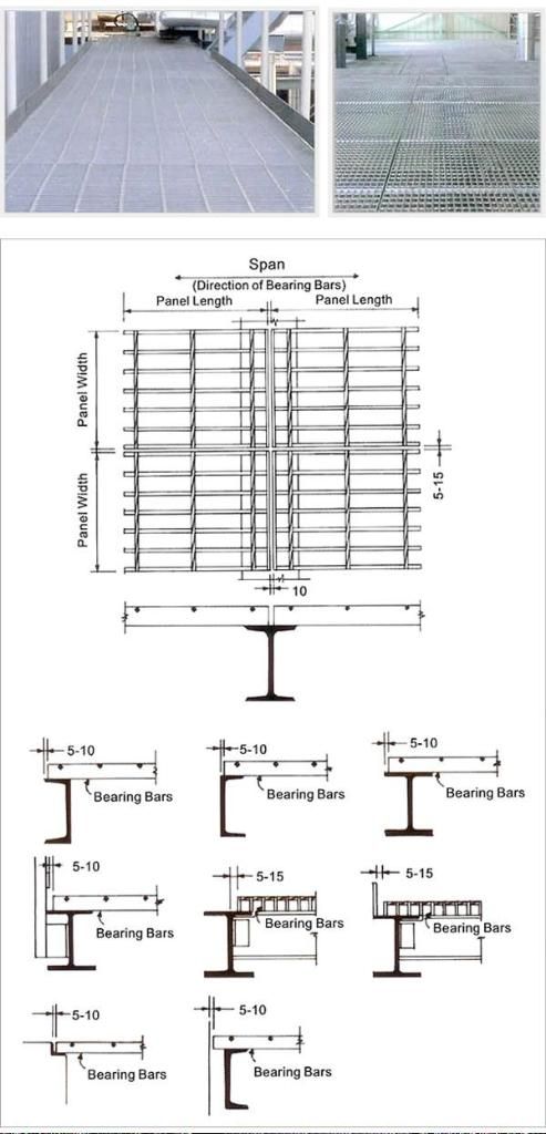 钢格板的安装时,钢格板受荷扁钢两端必须支承在钢粱或其它支承架上,每端搭接长度不少于25mm。两钢格板间距通常为10mm,安装时需根据图纸要求和现场实际情况作适当调整,在安装钢格板时最小安装间距应满足以下要求:钢格板之间间距为3mm,钢格板与相邻结构间距为10mm。